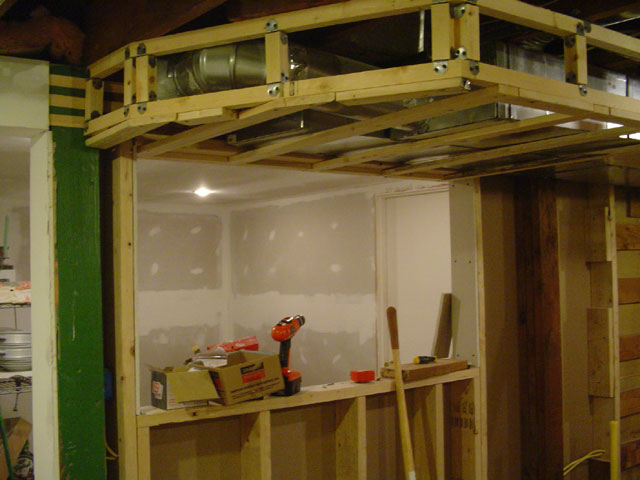 The airreturn vent on the new furnance ducting was a bit of a puzzle. At first we planned on just leaving it exposed. It is a basement, and really what would it hurt to have the air return exposed. The more we thought about it the more I wanted to cover it up. So josh and I headed to home depot and basically took the lego approach to the problem. With a rough idea of how we'd handle this, we just loaded up with 2x2s, 2x1s and a box of brackets.